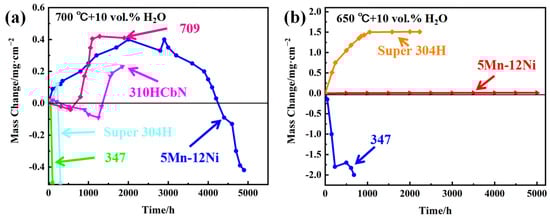 In order to confirm the feasibility of Mn replacing Ni in AFA steel, the 8OC-I (5Mn-12Ni) experimental steel was compared with the commercial steels, as shown in Figure 9. From Figure 9a, it can be seen that obvious spalling occurred for 347 and Super 304H and the mass seriously decreased after oxidation for less than 500 h under the condition of 700 °C + 10 vol.% H2O. The mass of 709 and 310HCbN decreased first and then increased, which indicated that the oxide film may have a self-repair ability. The mass gain of 709 is slightly larger than that of 5Mn–12Ni, while the mass gain of 310HCbN is smaller than that of 5Mn–12Ni. Moreover, the mass of 5Mn-12Ni steel decreased and the oxide film peeled off after oxidation for about 3000 h, which indicated that the 5Mn–12Ni experimental steel has an oxidation resistance similar to that of commercial steel. In Figure 9b, under the condition of 650 °C + 10 vol.% H2O, the mass gain of 5Mn-12Ni experimental steel is very small, but the mass increase in Super 304H is obvious, and the spalling of 347 appeared at the beginning. The results show that the oxidation resistance of 5Mn–12Ni experimental steel is much better than that of 347 and Super 304H commercial steels.