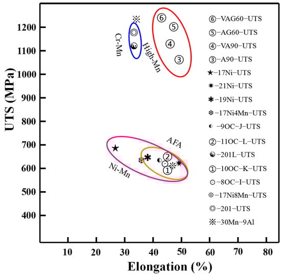 In order to improve the performance of cars as well as save energy and reduce emmition, light-weight has become a crucial research topic in automotive industry [57,58]. Therefore, low-density steel (LDS) has become a research hotspot [57]. Al is a light element, and it is added to 10 wt.% or so. In this case, the formation of κ-carbides ((Fe, Mn)3AlC) and ((Fe, Mn)3AlCx) in LDS provides high strength but relatively poor plasticity (blue circle area) [57]. The addition of precipitated phase elements such as V can form a second phase at the nanoscale [52]. This not only ensures the high strength of high manganese steel, but also improves plasticity (red circle area). Of course, a high Mn steel is not suitable for use at high temperatures due to the easy segregation of Mn elements. In AFA steel and general austenitic stainless steel, replacing Ni with Mn will reduce the strength and increase the elongation (pink and orange circle areas), as can be seen in Figure 10.