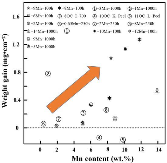 In terms of antioxidant properties, it was found that the weight gain rate of 3Mn was higher than that of 1Mn, as seen in Figure 11 [59]. Lu et al. compared the samples of 0.65-Mn, 2-Mn, and 8-Mn, and found that the oxidation weight increased with the increase in Mn content [60]. The mass gain of this process is mainly a Mn-rich layer (Mn2O3, Mn3O4 and FeMnO3) [60,61]. Su et al. added 9 wt.% Mn to austenitic steel, and after oxidation for 100 h, the mass greatly increased [62]. The obvious effect of the addition of Al on the antioxidant properties is highlighted here. Zhao et al. suggest that the Mn content in AFA steel controlled in the range of 6–8 wt.% showed better oxidation resistance (800 °C, in air) [63,64] compared with the data from Brady et al., in which the content of Mn is 2 wt.% [21]. This indicated that, generally, the weight gain after high-temperature oxidation increased along with the increase in Mn content, but the story in AFA steel is still not clear, and it seems that, in the high-temperature environment absence of water vapor, the Mn content can be appropriately high (Figure 11).