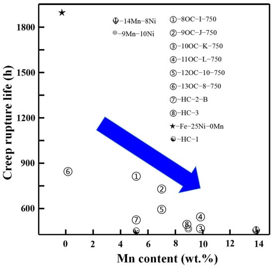 Figure 12 collected and summarized the relationship between the content of Mn and creep performance. It is obvious that Mn-substituted Ni will seriously damage the creep resistance. At high temperature, the Mn diffuses rapidly to the surface, so the effect of stabilizing austenite near the surface will be weakened, which will influence the creep resistance. Therefore, the amount of Mn added to austenitic steel used at high temperature must be very limited. Fe–25Ni–0Mn has a very high creep life, as shown in Figure 12. The reason is that, in addition to Mn-free, the addition of pre-strain and Ti promotes the formation of a large number of very fine carbides (TiC/secondary NbC) which is beneficial for the improvement of creep properties [65,66]. From this point of view, it is possible to make up the loss of creep properties caused by adding Mn by adjusting the treatment process and micro-alloying the composition design.