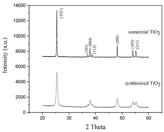 Titanium dioxide (TiO2) nanoparticle synthesis was performed through the sol–gel method [26,27], from the precursor titanium isopropoxide (IV) (Sigma-Aldrich, St. Louis, MO, USA, 97%). Shortly, absolute ethanol (Merck KGaA, Darmstadt, Germany EMSURE, 99.7%) was used as solvent; 28.6% of the titanium isopropoxide precursor was added to 71.4% of ethanol and left under constant stirring for 30 min; and pH < 2 was controlled with hydrochloric acid (HCl) (J.T. Baker, Phillipsburg, NJ, USA, 36.5–38.0%) until a gel was obtained, which was placed in a drying oven and kept at 80 °C for 24 h. The solid material was calcined at a temperature of 400 °C for 1 h. Physicochemical characterization of both synthesized and commercial TiO2 (RA, Fermont) powders was performed by means of Scanning Electronic Microscopy (SEM) with a JEOL JSM-6010PLUS/LA microscope, equipped with an X-ray Dispersive Energy Spectroscope (EDS). For the identification of the phases, an X-ray diffraction analysis (XRD) was performed on a Ray Diffractometer Bruker D8 Advanced Davinchi with a copper Kα line radiation (CuKα) and, from the peak intensity of the DXR pattern, crystallite size was determined by means of the Debye–Scherrer formula [28].