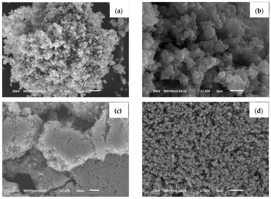 The micrographs obtained via SEM for both the synthesized and commercial TiO2 powders are presented in Figure 2. The image in Figure 2a corresponds to the micrograph of the synthesized TiO2 powders at 1000× magnification, in which clusters of diminutives particles with narrow particle size distribution of submicron order can be observed. The image in Figure 2b corresponds to the same powders at 7000× magnification, in which the semi-spherical morphology of the particles can be appreciated in greater detail; the average particle size estimated from the micrograph was ~0.59 µm, with narrow particle size distribution, which also presented a higher degree of agglomeration. It is worth mentioning that at this stage the synthesized TiO2 powders had not been subjected to any dispersion or grinding process, they were analyzed directly from how they were obtained after synthesis. The image in Figure 2c corresponds to a micrograph of the commercial TiO2 powders at 1000× magnification, in which clusters of particles much smaller than those of the synthesized TiO2 powders can be observed. At 7000× magnification (Figure 2d), commercial TiO2 powders with a homogeneous dispersion of semi-spherical morphology particles can be seen in greater detail, and the estimated average particle size was 0.2 µm. However, the crystallite size of the synthesized TiO2 was approximately 50% smaller than that of the commercial TiO2, suggesting a larger surface area that can result in more active sites in the photocatalyst.