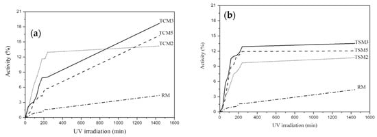 Regarding the coating mortar samples with synthesized TiO2 additions (Figure 3b), the TSM3 mortars also showed the highest photocatalytic activity, and also had the highest degradation efficiency of 13.5%. In descending order, the TSM5 mortars showed a degradation efficiency of 12% and the TSM2 mortars of approximately 10.6%. All TSM mortars presented a gradual increase until 3.5 h of UV irradiation; subsequently, a steady state was reached for the determined time interval, suggesting that there is no further increase in photocatalytic activity for longer irradiation times. The photocatalytic activity of both TCM and TSM was greater for coating mortars with 3% TiO2 addition, followed by mortars with 5% added, mortars with 2% and finally the reference mortars.