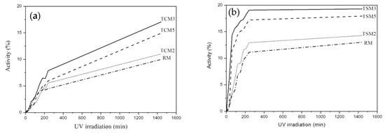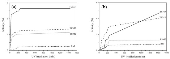Photocatalytic activity in coating mortar samples exposed to methyl range irradiated with UV. (a) TCM mortars, (b) TSM mortars.