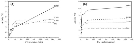 The photocatalytic activity of the TCM and TSM mortars, exposed to methyl orange and irradiated with UV, is presented in Figure 4. The same trend may be observed for the above-discussed mortars. However, in this case, the maximum value of the photocatalytic activity reached a degradation efficiency of 8.8% for the TCM3 mortar (Figure 4a). As for the previous mortars, in descending order, the photocatalytic activity of the TCM5 mortar occupied the second place with a degradation efficiency of 4.5%, the TCM2 mortars had a degradation efficiency of 3.6% and, finally, for RM an efficiency below 1% was obtained. The curve behavior in Figure 4a indicates that the methyl orange degradation efficiency for all TCM mortars reached a steady state after 4 h of UV irradiation. It was found that there is a greater removal efficiency of red wine than of methyl orange dye in TCM mortars exposed to UV irradiation. In Figure 4b, the photocatalytic activity of the TSM mortars is presented. Again, TSM3 presented the highest photocatalytic activity with a degradation efficiency of 4.7%, while TSM5 presented only 4%; both the TSM3 and TSM5 samples have an upward slope, which suggests an increase in activity over time. TSM2’s degradation efficiency was 3.4%, and these mortars reached a stationary state behavior after 2.5 h of UV irradiation. Coating mortars with addition of synthesized TiO2 showed a lower degradation efficiency for both red wine and methyl orange dyes than mortars with commercial TiO2 additions when exposed to UV radiation.