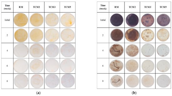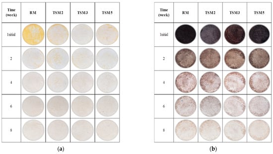 In the image of Figure 7, the results for the RM and TSM mortars are presented qualitatively (digital photographs). After the immersion process for 24 h in the dye solutions, methyl orange (Figure 7a) and red wine (Figure 7b), both types of coating mortar were exposed to the weather for two months. In general, red wine presented a greater degree of dirtiness on the surface, which indicates that red wine favors the proliferation of micro-organisms such as mold [27], a phenomenon that was not the focus of this investigation. In the initial week, the TSM mortars with all TiO2 additions showed a lower degree of impregnation of the solutions than the RM mortars, which was attributed to a lower porosity achieved by the coating mortars due to the effect of the TiO2 nanoparticles and which was reflected in the increase in mechanical resistance shown in the results of the compression resistance tests. Nevertheless, TSM3 (for methyl orange) and TSM2 (for red wine) presented a lower degree of dirtiness on their exposed surface. Progressively, after 8 weeks, all mortars were effectively self-cleaned, presenting a clearer surface with fewer imperfections caused by the contaminant.