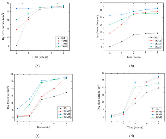 The RM reference mortars showed the highest absorption of dyes, with a stained surface area of 94.8% for those submerged in methyl orange and 100% for red wine. The self-cleaning effect in the coating mortars as a function of the dye-free surface area is presented in the graphs of Figure 9. Figure 9a,b correspond to the TSM mortars in the methyl orange and red wine solutions, respectively, where the TSM3 mortar shows a self-cleaning effect from the beginning of exposure, and also the highest clean surface values. Furthermore, they achieved a greater self-cleaning effect when they were exposed to red wine. It is highlighted that the rest of the mortars (TSM2 and TSM5) showed a better performance from the second week of exposure, stabilizing in the fourth week. In terms of the TCM mortars in the methyl orange solution (Figure 9c) and in red wine (Figure 9d), it is shown that, for all mortars, the self-cleaning effect appears after the third week, with the best performance for TCM3 and the poorest for RM, with all stabilizing between the sixth and eighth week, with the best performances as follows: TCM3, TCM2, TCM5 and RM, in decreasing order. For all cases, after eight weeks of exposure to the weather conditions, there was greater color degradation in mortars with 3% of TiO2 addition.