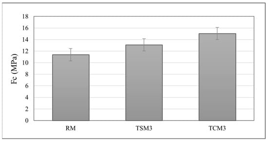 Based on the results obtained for the photocatalytic activity behavior, the compressive strength test was carried out only on the preselected RM, TSM3 and TCM3 mortars. This mechanical resistance test was performed as described in [33], which consisted of determining the maximum compressive strength that the material resists through the gradual application of an axial load in two opposite faces of the specimens’ square section until failure occurs. The test was carried out in a hydraulic press.