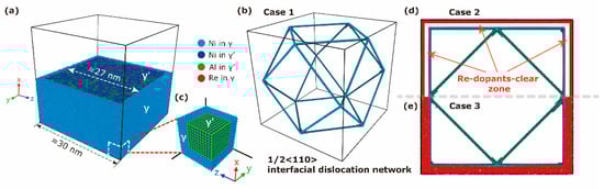 - Zhu, T.; Wang, C.-Y. Misfit dislocation networks in the γ/γ’ phase interface of a Ni-based single-crystal superalloy: Molecular dynamics simulations. Phys. Rev. B 2005, 75, 014111. [Google Scholar] [CrossRef]