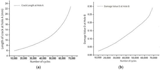 | Total Number of Cycles N | Hole A Crack Length | Hole B Damage D |