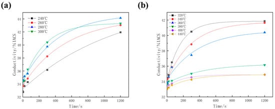 Figure 1. Influence of isothermal treatment parameters on conductivity of quenched samples: (a) 240~300 °C; (b) 320~440 °C.