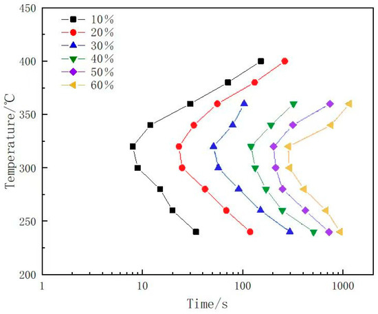 where f is the transformation fraction, γ is the conductivity of the samples, γmin is the minimum conductivity (32% IACS), and γmax is the maximum conductivity (45.8% IACS). The holding times corresponding to 10%, 20%, 30%, 40%, 50%, and 60% transformation of supersaturated under different isothermal temperatures can be calculated by interpolation. Subsequently, by connecting the temperature (T)–time (t) points with the same fraction, the TTT curve of the alloy can be constructed, as shown in Figure 2. It can be seen that the TTT curve of the alloy exhibits a “C”-shaped profile, with a nose temperature of approximately 320 °C. The shortest transformation time at the nose temperature leads to an extremely rapid decomposition of the supersaturated solution, resulting in high quench sensitivity. In contrast, the longer transformation times in the high-temperature and low-temperature regions lead to a relatively slower decomposition of the supersaturated solution and lower quench sensitivity.