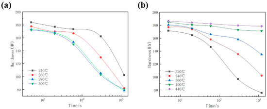 Figure 3. The influence of isothermal treatment on the hardness of the as-aged samples: (a) 240~300 °C; (b) 320~440 °C.