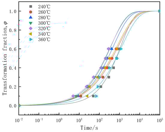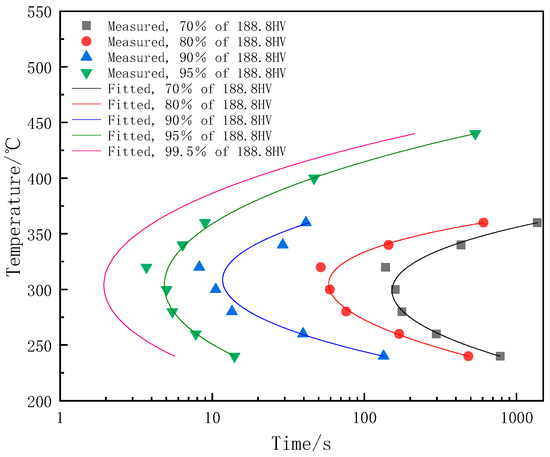 The TTP curve is typically employed to depict the correlation between material properties, isothermal treatment temperature, and isothermal treatment time, and it can be fitted according to Equation (2) [17,18]: