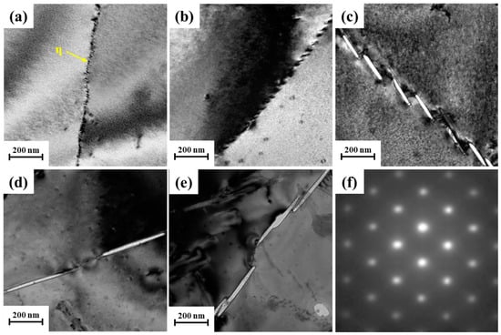 Figure 6. TEM images around the grain boundary of the as-aged samples isothermally treated at 320 °C with different holding times: (a) 5 s, (b) 20 s, (c) 60 s, (d) 300 s, (e) 1200 s, (f) SAED image.