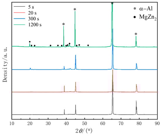 According to the analysis in the previous sections, the premature precipitation during isothermal processes can seriously affect the mechanical properties of the components. A large number of equilibrium phases are precipitated during isothermal treatment with increasing the holding time, coarse especially at the nose temperature. The XRD results of the quenched samples after isothermal treatment at 320 °C for different times are shown in Figure 7. It can be seen that the peak intensity of η phase (MgZn2) increases gradually with isothermal time. The MgZn2 peaks were not observed of the sample before isothermal treatment for 20 s. When the holding time was extended to 300 s, the intensity of MgZn2 peaks was significantly enhanced, which indicates that a large number of equilibrium phases were precipitated in the matrix. When the holding time was extended to 1200 s, there was no significant increase in peak intensity, which indicates that MgZn2 was fully precipitated, which is consistent with the TEM results (Figure 6).