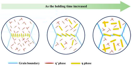 where φ represents the phase transformation fraction, k is a constant related to nucleation and growth rates, t signifies the isothermal time, and n is contingent on the precipitation mechanism. The isothermal transformation curves for 7A65 aluminum alloy are presented in Figure 8, and the corresponding equation parameters are detailed in Table 2. It is evident that, as the temperature rises, the rate of supersaturated solution transformation initially increases and then decreases, with the k value peaking at 320 °C, which is consistent with the experimental results. Furthermore, the emergence of plate-like or needle-like phases within the grain is governed by the parameter n, wherein a value proximal to 0.5 signifies the prevalence of the former, while a value approaching 1 signifies the predominance of the latter [28]. The range of fitted n values is 0.5–0.7, which coincides with the TEM observations. The rapid transformation of the supersaturated solution at the nose temperature results in a substantial depletion of solute atoms and the swift precipitation of coarse equilibrium phases within the matrix, significantly impacting the mechanical properties of the component. Based on the experimental results, the scenario of precipitation behavior of the as-aged 7A65 aluminum samples isothermally treated at the nose temperature is shown in Figure 9. During short isothermal treatments, only a limited number of fine equilibrium η phases form at the grain boundaries, typically oriented perpendicularly to the grain boundaries. Due to the short holding time, supersaturation degree is still high and a large number of nanoscale η′ phases can be precipitated in the matrix during the subsequent aging process. As the isothermal time increases, the η phases at the grain boundaries coarsen and align parallel to the grain boundary. Additionally, coarse equilibrium phases develop within the grain boundaries, signifying significant premature precipitation. The solute atoms are notably depleted during isothermal treatment, particularly in the vicinity of the η phases, resulting in diminished quantities of nanoscale η′ phases and a subsequent reduction in the mechanical properties of the as-aged samples.