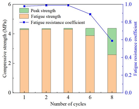 Figure 5 depicts the variation law of the fatigue failure stress and uniaxial compressive strength of grouting material specimens under various loading conditions. The grouting material in the loading-unloading process causes fatigue failure, resulting in cyclic loading and unloading strength being lower than uniaxial compressive strength. The increase in loading-unloading times also affects fatigue strength, as can be seen from Figure 5. The compressive strength is decreased by 2%, 1%, 1%, 11%and 41%, respectively, when the number of loading cycles is 1, 2, 4, 6, and 8. When the number of loading cycles does not reach the critical value, increasing the number of cycles has a minor impact on fatigue failure strength [24]. However, when the number of loading cycles reaches the critical value, the fatigue strength will be drastically reduced. Therefore, it is essential to research the number of loading cycles.