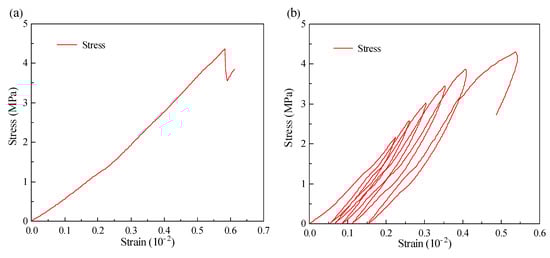 Figure 6’s first and last stress curves show that the initial loading curve is concave in the last stage stress, meaning that even as the strain gradually increases, the stress is always kept at a low level, which corresponds to the process of compaction and sealing of internal pores, which is referred to as the compaction stage [27]. The specimen is moving toward a dense state as a result of the gradual compaction of the pores, and the stress-strain curve growth exhibits a linear change trend, indicating that it is in an elastic stage. The strain growth rate is then noticeably accelerated as a result of the ongoing stress increase, and the curve top takes on the shape of a spindle. This shows that the loading process at this point has caused the internal pores to rupture along with the development of microcracks, which is known as the crack development stage. The grouting material specimen only goes through the compaction and elastic stages under higher stress, however, because of the low upper loading limit level, and the top of the curve is sharply angled.