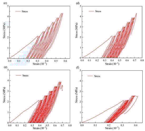 Under uniaxial compression and cyclic loading without exceeding the number of loading cycles, the stress-strain curve is shown in Figure 6. As the amount of loading stress rises for a single cycle, the hysteresis area and width of the process become increasingly important. Excluding the last and pressure groups, for multiple cycles, the curve is initially sparse and then dense under each cycle load, and the deformation of the specimen primarily happens in the first cycle, which is depicted as a large opening on the curve [26]. This is because each increment of cyclic stress will generate fatigue cracks and significant deformation, and with subsequent stress cycling, only the gaps and cracks will be compressed, resulting in relatively small specimen deformation. This leads to a tendency for the hysteresis curve density to stabilize. The hysteresis curve becomes sparser and thinner as cyclic loading stresses get closer to failure, such as during the final few cycles. When the number of loading cycles reaches a specific value, the fatigue compressive strength decreases rapidly because the fatigue failure of the specimen occurs under multiple loading.