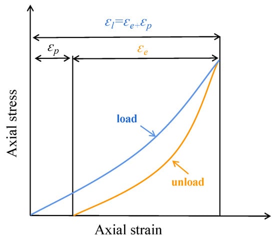 When the loading strain and residual strain are compared, it is discovered that the loading strain is more sensitive to stress changes than the residual strain, and the relationship between residual strain and stress is more linear, whereas the loading stress exhibits a stepped increase, indicating that when the stress is abrupt, the residual strain accounts for a smaller part of the loading strain, and the elastic strain accounts for the majority [30].