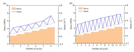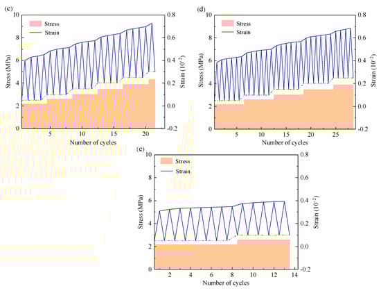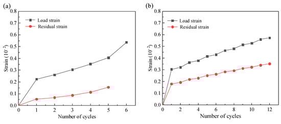 The loading strain and residual strain curves of the grouting material are shown in Figure 9, which grow after repeated loading-unloading and create a dramatic increase as the stress level increases [29]. In addition to the last stage of cyclic stress, when in the same cyclic stress level, the first cyclic load strain increases the most, and then gradually slows down to stability, in the final breaking stage, the strain increases rapidly, the specimen produces fatigue failure, and the specimens with the number of load cycles of 1, 2, 4, 6 and 8 of each stage are cycled 6 cycles in the cycle to the sixth stage, 12 cycles to the sixth stage, and 21 cycles to the sixth stage, destruction occurs when there are 24 cycles to the fifth stage and 14 cycles to the second stage.
