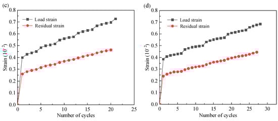 The load strain and residual strain of each group of specimens: (a) 1 cycle; (b) 2 cycles; (c) 4 cycles and (d) 6 cycles.