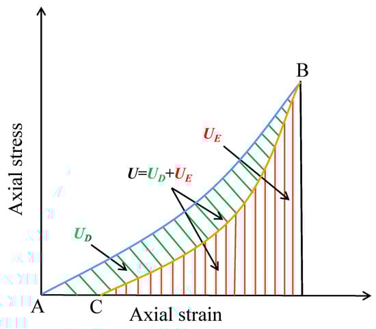 Figure 10 depicts a diagram of the energy density calculation. Point A is the starting point of loading, point B is the maximum point of loading, and point C is the lowest point of unloading. The total energy density U is denoted by the area around the loading curve AB and the abscissa, and the elastic energy density UE is denoted by the area around the unloading curve BC and the abscissa. The difference between the total energy density and the elastic energy density, that is, the area around the curve ABC and the abscissa, is the dissipative energy density UD. The energy dissipation process, according to the second law of thermodynamics, is unidirectional and irreversible, resulting in the propagation of cracks within the specimen and an increase in plastic deformation. The elastic energy accumulated in the specimen, on the other hand, is reversible, and as the elastic deformation increases during loading and unloading, a large amount of elastic energy is accumulated in the specimen, and this elastic energy is released during unloading [32]. The calculation formula of dissipation energy is as follows: