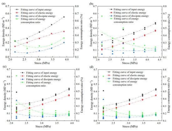 Figure 11 shows that the various energy densities and energy dissipation ratios of different cycles are consistent, the input energy density and elastic energy density increase at different rates with the increase of stress level, and the dissipative energy density and energy dissipation ratio decrease first and then increase with the increase of stress level.