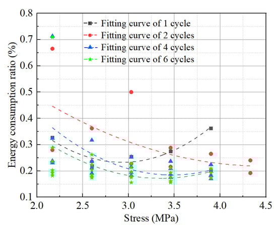The energy consumption ratio of the grouting material for various loading cycles is shown in Figure 12.