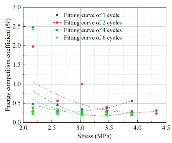 The difference between the maximum competition coefficient and the minimum competition coefficient of all groups of specimens at the same stage is the total difference, and the difference between the maximum competition coefficient and the minimum competition coefficient of the individual group is the stage difference. As shown in Table 7, a single load of specimens with different loading cycles is significantly lower than multiple loading, possibly due to a single load’s limited fluctuation range. For multiple loading, 92% of the total difference in the competition coefficient comes from the difference of the first stage, and it can be seen that the first stage is the abrupt stage of the ratio of dissipative energy density and elastic energy density, which is primarily due to the specimen being compacted at this stage, the internal voids and cracks are reduced, and the plastic deformation is large, resulting in a slowdown of the increase of plastic deformation after the first stage [39].