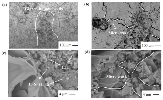 As can be seen in Figure 14c, in the absence of cyclic loading, the hydrated calcium silicate cementitious material (C-S-H) generated by both cement hydration and calcium hydroxide (CH) reaction with sodium silicate is tightly connected with the CH produced by cement hydration in the shape of plate-like crystals [40]. On the other hand, the overall bonding degree of the products generated by the reaction of glazed hollow beads with cement and sodium silicate is better. It can be seen from Figure 14d that after the cyclic loading damage, when the glazed hollow beads are not yet destroyed, the cement and sodium silicate products are already damaged, cracks are produced, and the cracks are dispersed outward with the glazed hollow beads as the centre, which means that the damage starts from the intersection of the glazed hollow beads and the cement and sodium silicate products, which is because the glazed hollow beads themselves have low strength and are more prone to breaking than the cement and sodium [41]. Stress concentration occurs. This is due to the low strength of the glazed hollow beads, which prevents them from supporting the force that is transmitted from the cement and sodium silicate materials. The occurrence of stress concentration, which, in turn, results in the deterioration of the contact surface first, demonstrates that the function of glazed hollow beads in the bearing is quite restricted.