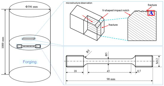 Forging size and sampling position and size of tensile specimen and impact specimen.