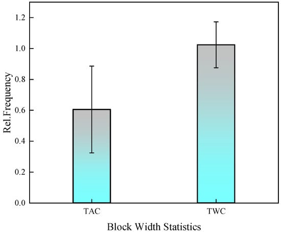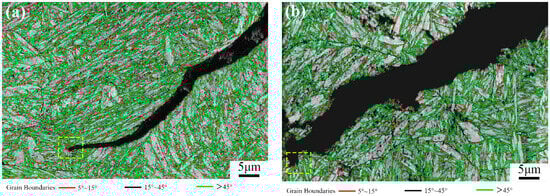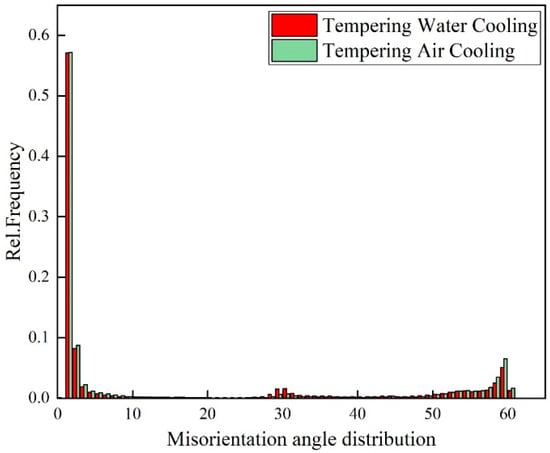 The AZtecCrystal software was utilized to analyze the distribution of grain boundaries near the cracks. Figure 7 shows the misorientation distribution of grain boundaries near the cracks under two conditions. Low-angle grain boundaries (LAGBs) with misorientation angles from 2° to 15° are represented by red lines, while high-angle grain boundaries (HAGBs) with misorientation angles from 15° to 45° are represented by black lines, indicating a minimal difference between air-cooled and water-cooled tempering conditions. Boundaries with angles greater than 45° are denoted by green lines. Figure 8 compares the relative frequencies of LAGBs and HAGBs under two different tempering cooling rates, revealing a similar frequency for both low- and high-angle grain boundaries. Previous studies have suggested that HAGBs hinder crack propagation [13,14,15]. Additionally, research has indicated that LAGBs play a crucial role in both strength and toughness. The high dislocation density generated in the overcooled austenite during processing can be inherited by martensite, forming sub-grains through dynamic recovery. Such low-angle grain boundaries have an inhibiting effect on crack propagation. In the yellow dashed box in Figure 8, low-angle grain boundaries are concentrated at the crack arrest position. The frequency of grain boundaries does not change significantly under different tempering cooling rates for the experimental steel. However, after water cooling and tempering, as the martensite lath bundles widen, the position of low-angle grain boundaries changes. Compared to the air-cooled state, more low-angle grain boundaries appear between the lath bundles rather than around the original austenite grain boundaries. Figure 9 shows the relative frequency of grain boundary structure by different tempering cooling methods; no significant changes were observed in the boundary frequency under the two different cooling methods.