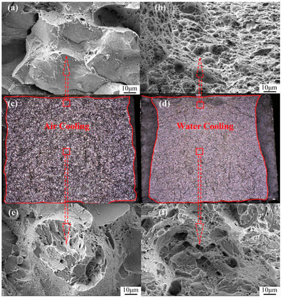 Different tempering cooling methods’ −40 °C low-temperature impact fracture morphology: (a) air-cooled fracture initiation zone SEM, (b) water-cooled fracture initiation zone SEM, (c) air-cooled macrofracture zone, (d) water-cooled macrofracture zone, (e) air-cooled fracture extension zone SEM, and (f) water-cooled fracture extension zone SEM.