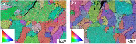 EBSD micrograph of protoaustenite grain reconstruction for (a) tempering air cooling and (b) tempering water cooling.