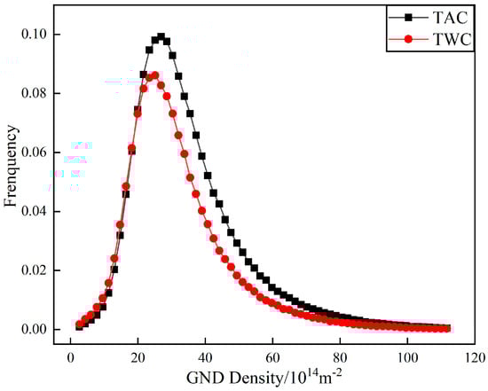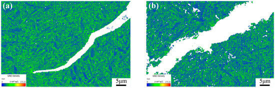 Geometrically necessary dislocations (GNDs) can provide quantitative information about localized plastic deformation. In some studies, this method can also be used to characterize the distribution of orientation deviations in cracks. Through the AZtecCrystal software, GND distributions under different tempering cooling rates are color-coded, as shown in Figure 9. Blue represents regions with lower dislocation orientation deviations, while green represents regions with high geometrically necessary dislocation densities. Larger GNDs are distributed near the crack, and at the crack tip in Figure 10a, there is a higher density of geometrically necessary dislocations. It can be observed that GNDs tend to be distributed at many low-angle grain boundaries, as low-angle grain boundaries hinder the slip of dislocations, leading to the accumulation of GNDs. In contrast, high-angle grain boundaries do not have a significant distribution of GNDs, indicating a strong ability to absorb dislocations. They are potential locations for crack initiation, and when cracks coincide with regions of high stress concentration and high-angle boundaries, crack initiation and propagation are accelerated [16]. Using the HKL Channel 5 software, GNDs were geometrically calculated for the two conditions, as shown in Figure 11. It can be seen that the frequency of GNDs is lower after tempering and water cooling, indicating more stable low-angle and low-energy grain boundaries. These boundaries resist sliding, thereby enhancing toughness.