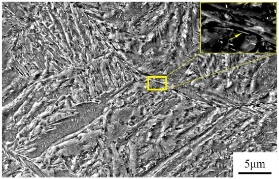 On the other hand, during the tempering process, the precipitation of Fe3C at grain boundaries and the segregation of impurity atoms lead to interface weakening and brittle fracture, as depicted in Figure 12. Fe3C exists in a rod-like form along the grain boundaries, and Table 2 provides the EDS analysis of Fe3C at the grain boundaries. The diffusion rate of impurity atoms at the grain boundaries is higher than that of iron atoms because there are more vacancies at the grain boundaries, which can promote dislocation migration. Consequently, there is a higher density of dislocations and impurity content at the grain boundaries, and the pinning effect of impurities can easily result in temper embrittlement [17,18]. McMahon proposed that during tempering in the embrittlement temperature range, Fe3C precipitates along the grain boundaries, and since impurities have low solubility in Fe3C, impurities are rejected and concentrated at the interface during carbide precipitation. This creates favorable pathways for crack propagation along the interface, constituting a non-equilibrium segregation process [19,20]. Rapid cooling after tempering suppresses the process of impurity element enrichment and segregation. The rod-like Fe3C transforms into a spherical shape, as shown in Figure 12. Table 3 shows the EDS of Fe3C in the yellow box in Figure 12. Figure 13a illustrates the rod-like Fe3C near the grain boundaries observed using TEM in the air-cooled state, while Figure 13b displays the spherical Fe3C near the grain boundaries observed using TEM in the water-cooled state. This process helps avoid the occurrence of the second type of temper embrittlement or eliminates already-formed temper embrittlement.