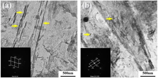 Figure 3 depicts the microstructure of the experimental steel after tempering at 590 °C, followed by air cooling and water cooling. Figure 3a displays the SEM morphology for air cooling, while Figure 3b presents the SEM morphology for water cooling. Upon observing the microstructure, it is evident that both air-cooled and water-cooled structures consist of a mixture of tempered martensite and bainite. In the air-cooled condition, the martensite laths mainly appear as long needle-shaped structures within the microstructure, with larger grain size. Scanning electron microscopy reveals that the carbides precipitated after air cooling are primarily located at the grain boundaries. In contrast, the water-cooled microstructure is more uniform, with martensite laths arranged in a plate-like manner. Fine carbides are observed to be dispersed within the lath matrix, as shown in Figure 4. The average block width of martensite is 0.6 μm for air cooling (TAC) and 1 μm for water cooling (TWC), as measured under SEM.