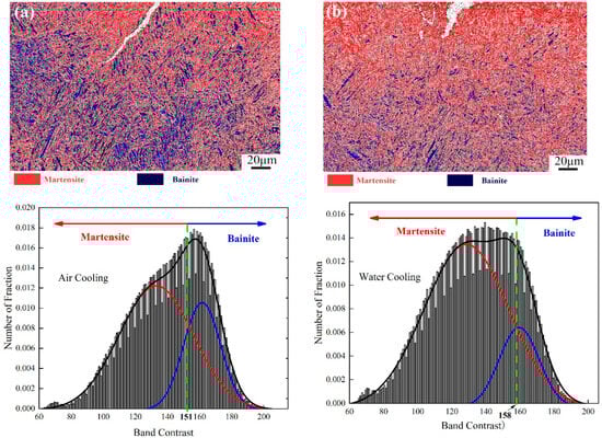 (a) Distribution of martensite and bainite complex structures in air-cooled and (b) water-cooled states.