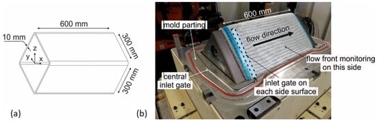 Fiber-reinforced composites (FRPs) have been among the high-performance materials in the field of lightweight construction for several decades. Their mass-specific properties are the main reason for their use in fields such as aerospace, wind energy, trains, and automotives. The mass-specific strength or modulus of elasticity are significantly higher than most metallic alloys, allowing for unparalleled efficiency. The properties of FRPs are strongly influenced by the fibers, matrix material, and laminate structure, among other factors [1]. There are a variety of molding processes used to produce FRPs depending on part geometry and quantity. Typical processes include hand lay-up processing, filament winding, pultrusion, autoclave processing, and resin transfer molding (RTM). RTM is a resin injection process that uses mainly low-viscosity thermoset resin systems such as epoxy resins or polyurethanes. To reinforce the components, a near-net-shape fiber semi-finished product, also known as a preform, is clamped in a closed mold. The resin system is preheated and premixed in a mixing chamber and then injected into the mold with pressure (1–20 bar). In addition, a vacuum is applied to increase the diffusion of the resin. As a result, the incoming matrix system completely encloses the previously dry fiber structure and subsequently cures. Out of the processes already mentioned, RTM has the greatest potential to meet the requirements for large production volumes, as demanded in the automotive and aviation sectors. This is mainly due to the fact that RTM can be used to produce three-dimensional, complex, and large composite parts with low tolerances and a high degree of automation.
