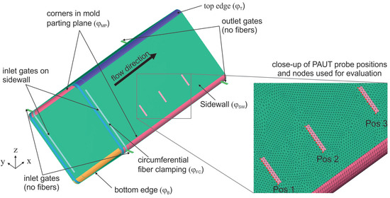 Figure 2 and Figure 4 also shows the gate variant implemented in the high-pressure RTM mold. It consists of two gates in the mold parting plane, each of which extends into two line gates on the adjacent sidewalls. The line gates are not circumferential to avoid resin runners in the upper and lower corner of the structure. In the experimental PAUT measurements, an uneven flow front was detected. Therefore, the model for the mold filling simulation is refined to allow for a comparison with the ultrasonic data obtained from the experiments. In addition to refining the mesh (82,642 elements), nodes are inserted at the exact positions of the PAUT probe. An area is defined where the left outside edge represents the mid line of the PAUT probe at each position. The distance between each node represents five times the PAUT element size. The arrival of the flow front is evaluated by taking the time when the filling factor for the node switched to one. Furthermore, zones of different are implemented into the model to simulate different compaction scenarios. Thus, there is a zone for the sidewalls named , the edges of the preform due to braiding and closing of the mold , and the top as well as bottom of the profile. These zones can be assigned higher or lower fiber volume content permeabilities, respectively, in the simulation model.