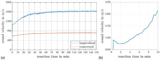 For the experiments, the resin was preheated to 50 °C and manually poured into the mold. From this point, ultrasonic transmission measurements were started and performed over a period of 9000 s, during which the longitudinal and transverse sound velocities were determined at 1 MHz. The results of the preliminary test are shown in Figure 6a.
