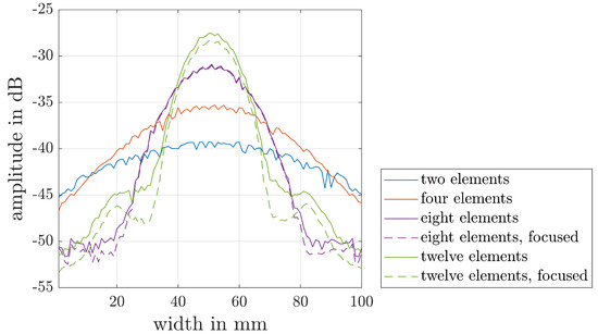 To select an aperture for the experiments, the amplitude at the depth of the later evaluation was simulated with different apertures. The simulation was carried out using CIVA NDE (EXTENDE, Massy, France) and the specifications in Table 3. In addition, a phase-delayed excitation of the elements was used for the 8 and 12 elements apertures to achieve a focusing of the signal at the investigated interface between the HP-RTM mold and the cavity underneath the center of the probe.