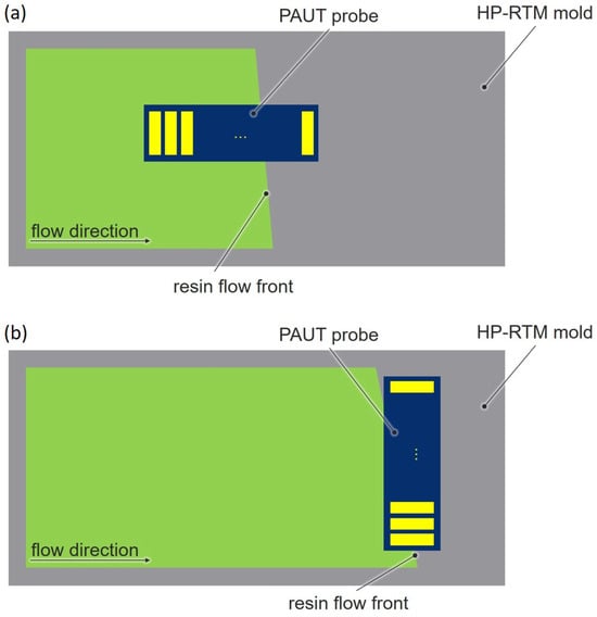 It was shown that the PAUT measurement method presented here can be used to determine the detection time, velocity, and shape of a flow front in an HP-RTM process with a thick-walled mold. By comparing the results with those of a mold filling simulation, it was also proven that this method can be used both for optimizing simulations and for process monitoring. A particular advantage results from the high spatial resolution of the results, which is linked to the pitch of the phased array probe and the aperture used. Thus, despite a locally limited measuring range, conclusions can be drawn about the global flow behavior in a large mold such as the presence of areas of high fiber compaction or flow channels in the mold, which significantly affect mold filling behavior. In order to confirm these conclusions, in further investigations, the monitoring method used should be extended by additional sensors distributed on the mold, e.g., single transducer probes. This would allow for a more global experimental observation. Likewise, an evaluation of the fiber volume content at different positions of the manufactured test structures could provide information on the compaction present during manufacturing.