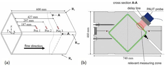In order to determine the parameters during the mold filling process, three measuring positions were defined along the test structure. These are located along the flow direction at 187 mm (Pos1), 297 mm (Pos2), and 427 mm (Pos3) intervals. Ultrasonic examinations, one horizontal and one vertical, were carried out at each of the measuring positions (Figure 9). Due to the size of the sensor and the limited space available, the sensor position could be varied in the X direction only.