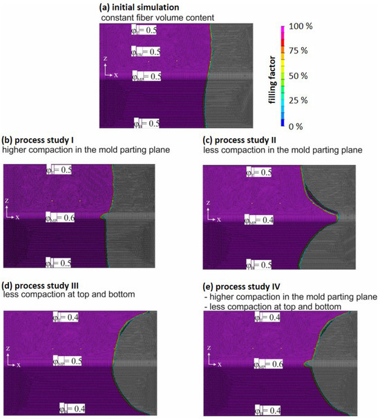 The simulation results show that increasing the fiber compaction impedes the resin flow, whereas less compaction enhances the flow. The effects on the shape of the flow front can be seen in Figure 10. It is found that higher compaction in the mold parting plane does not change the overall shape of the flow front in the flat surface of the preform. In contrast, less compaction in the mold parting plane alters the shape of the flow front as this resembles a resin runner Figure 7d. The latter is unlikely to occur in practice. In the experiments, it was observed that fibers will be pushed towards and compressed in the mold parting plane when the mold is closed. This circumstance was already taken into account in the design phase of the mold by an asymmetric location of the mold parting plane.