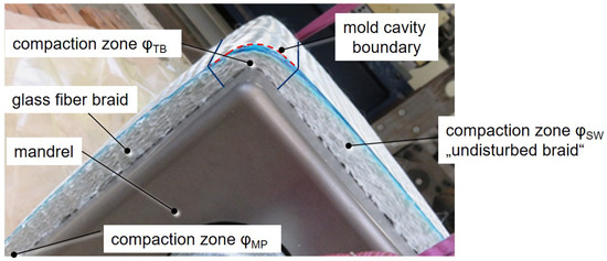 The 16-layer braid, created by guiding a mandrel with a robot back and forth through the center of the braiding wheel (Herzog RF 1/288-100), does not have a homogeneous fiber architecture. This is due to the rectangular shape of the mandrel compaction of the fibers being higher in the edge areas compared with the flat sides of the mandrel. Furthermore, a deviation of the desired fiber orientation occurs on the flat sides of a squared mandrel when compared with braiding on a cylinder [22,23,24,25]. In addition, each change in braiding direction causes a run-in zone where the fibers need to align themselves to a constant pattern. These effects lead to local deviations in fiber orientation, non-constant spacing between rovings, and locally varying compaction, which in turn affect the resin impregnation and local mechanical properties [26] of the cured part.