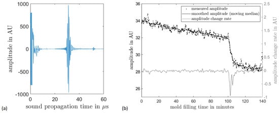 For the evaluation, the course of said amplitude was determined for each PAUT element as a function of the mold filling time (Figure 12b). The A-scan appears to be rather noisy, which is due to the signal losses in the interfaces located in the measuring range. Therefore, a high signal amplification was necessary, which significantly amplifies the existing thermal noise. In order to reduce this noise, a smoothing moving median filter was applied with a window of 50 measured values, which corresponds to a time period of 5 s. Based on the smoothed curve, the rate of change of the amplitude was calculated over five measurement steps or 0.5 s.