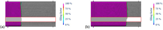 At the radii of the top and bottom edges, high preform compaction is observed during the preform process (Figure 11). If this greater compaction is mapped with a higher fiber volume content in the shell elements, an unrealistic simulation result is obtained because the shell elements assume homogeneous properties in the thickness direction. However, the compaction in the edge area is much higher than in the side surfaces of the preform, so that the preform thickness in the edge region is already lower than the cavity height (dashed line in Figure 11). Therefore, in reality, a flow channel for the resin exists. In approximation, this effect can only be represented with a locally lower fiber volume content (or higher permeability) for the shell elements at the top and bottom edges. Figure 10c,e show that less compaction (flow channel) at the top or bottom edge of the preform results in a higher flow in these areas, which alters the shape of the flow in the flat surfaces significantly. The progression of the flow front is faster towards the top and bottom of the profile.